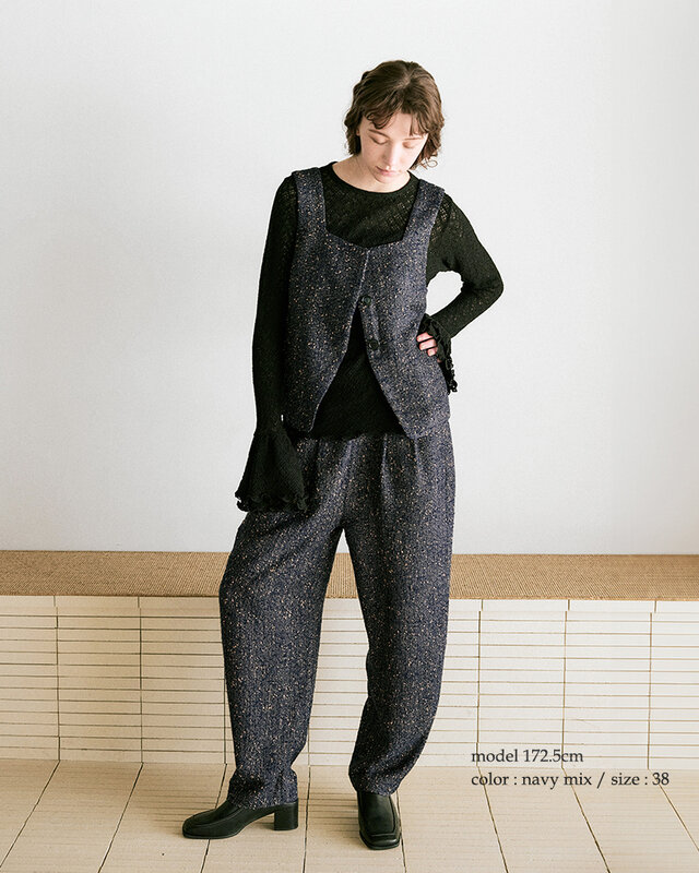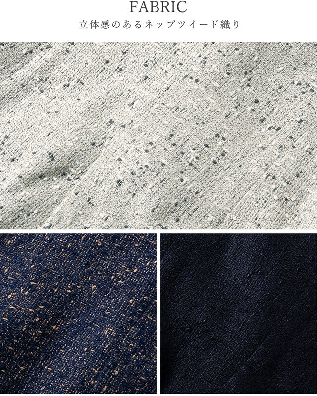 立体感のあるツイード織りに、ネップ糸を織り込んだ奥行きと存在感のある素材です。程よい厚みがあり、秋冬にぴったりな表情。
