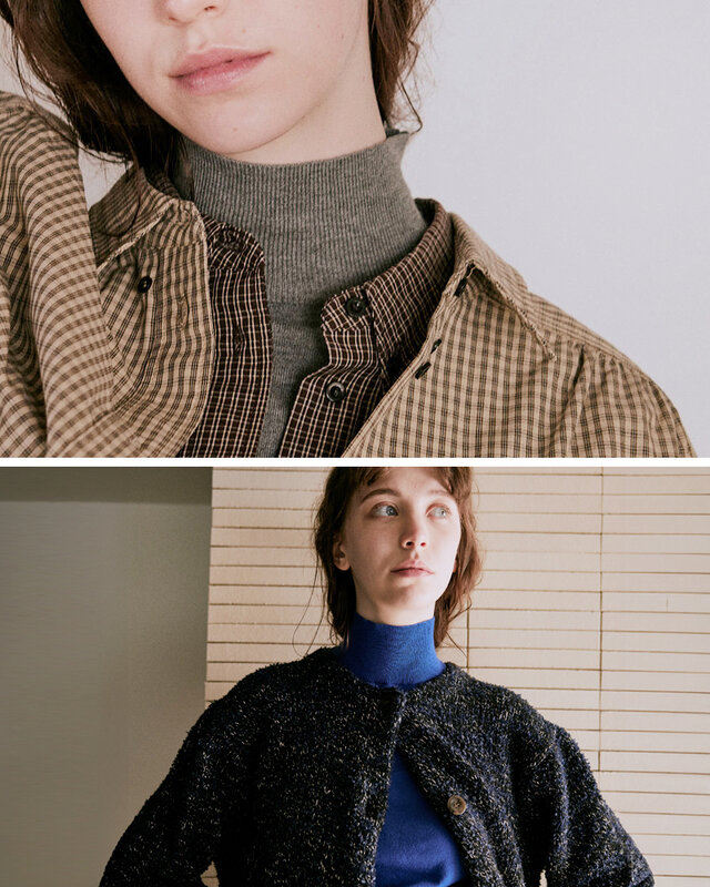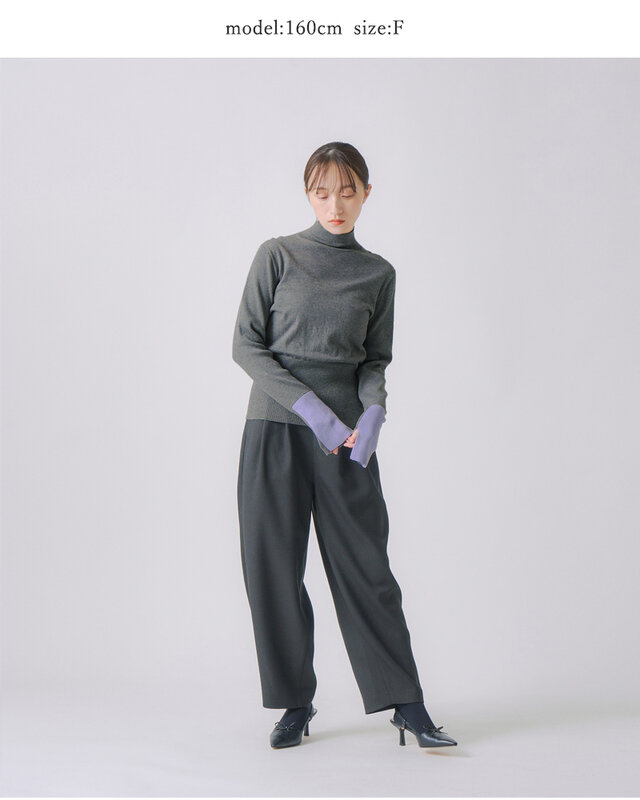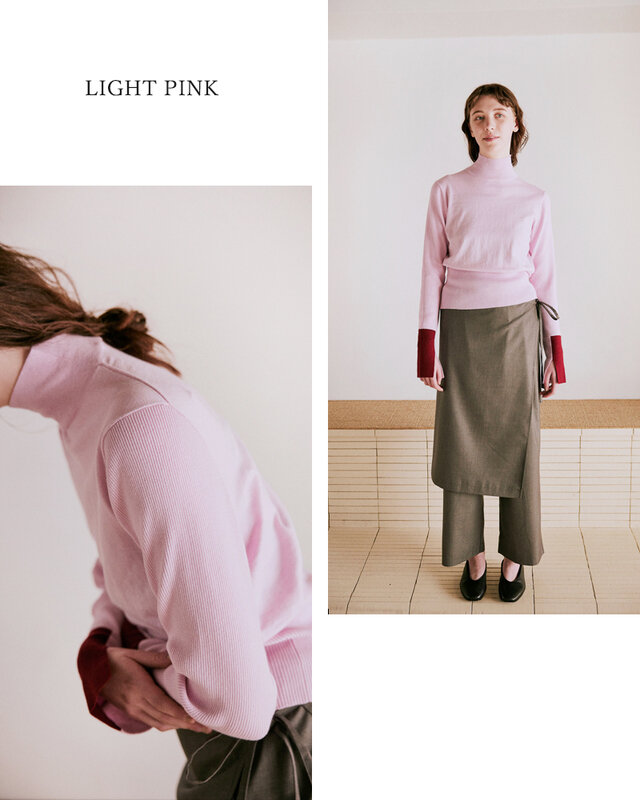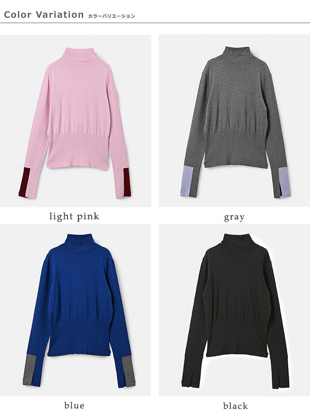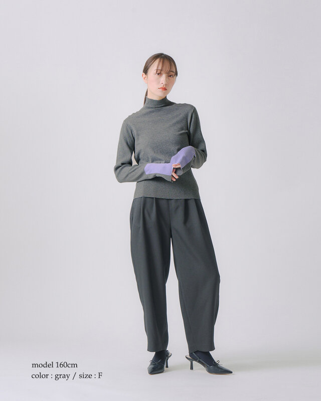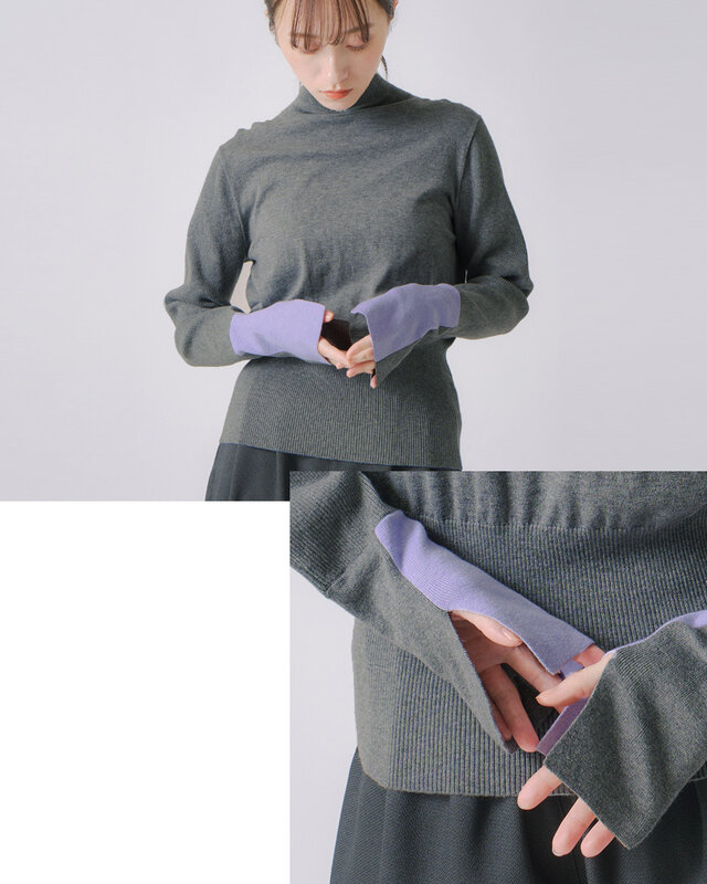 袖口を2トーンでカラーブロックにした大人の個性が光るデザイン。薄手でレイヤードしやすいニットなので、シーズンを選ばずにスタイリングしていただけます。