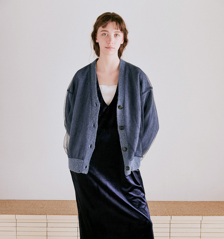 ハイネックやシャツ等のレイヤードが映えるスッキリとしたVネックデザイン。