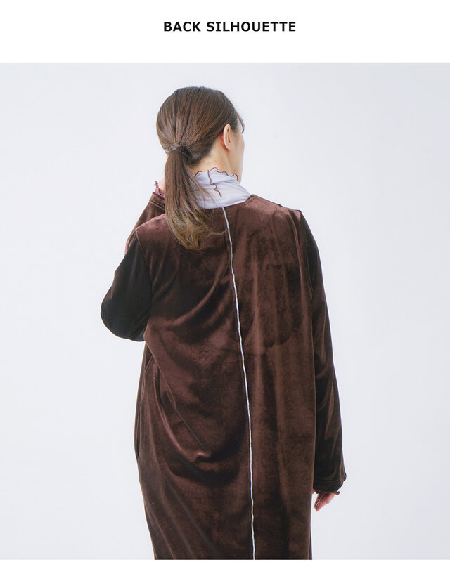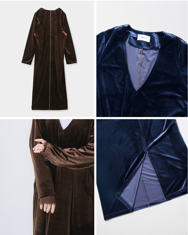 whyto(ホワイト)より、Vネック スリット ベロア ドレス “v slit velour dress”のご紹介です。すっきりとV開きにしたベロアドレス。縦長なラインで、女性らしいラインを意識したアイテムです。左裾にはコンシールファスナーがついており、開けるとサイドスリットになる仕様です。お好みでスリットの深さも調整可能です。センターバックには、配色のメロウで切り替えが入っており、バックスタイルにもこだわりました。