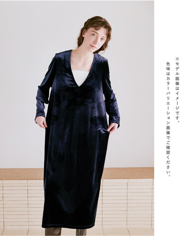 女性らしいラインを意識したベロア素材のVネックワンピース