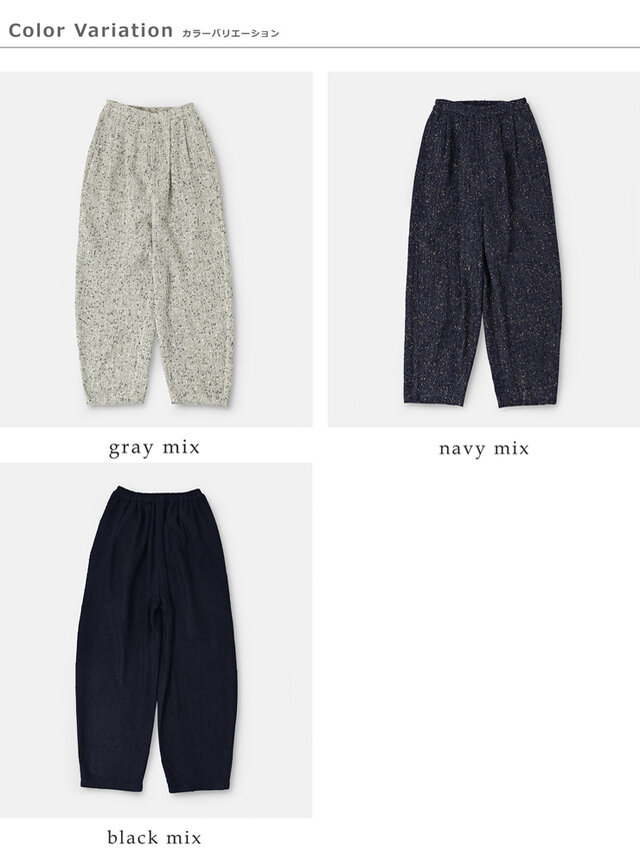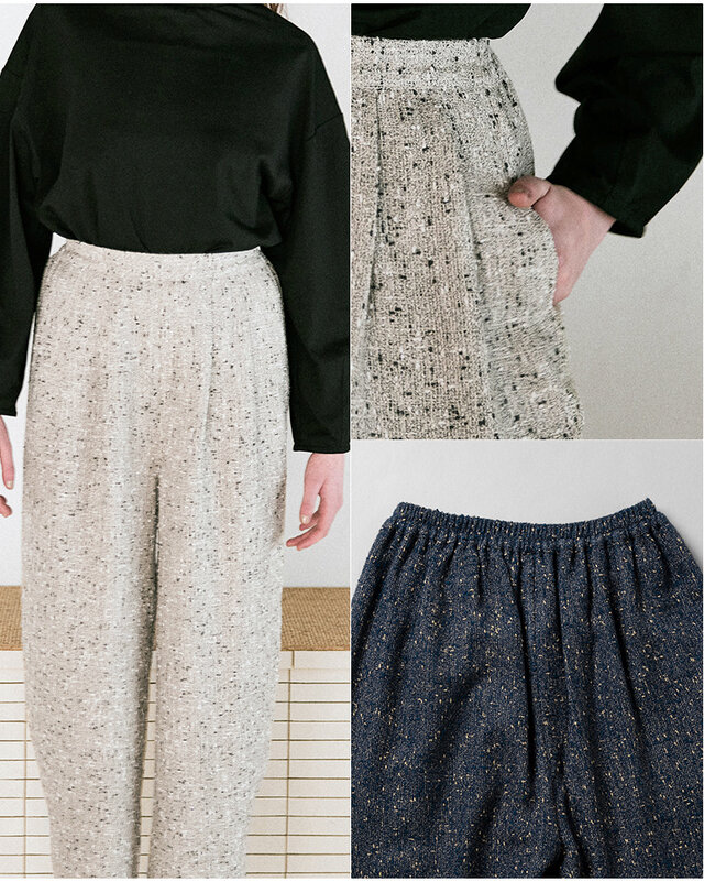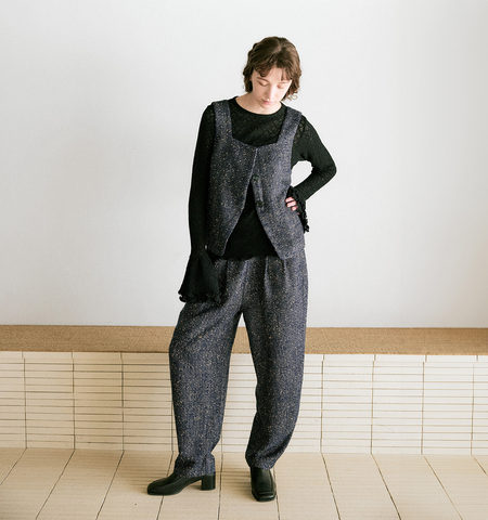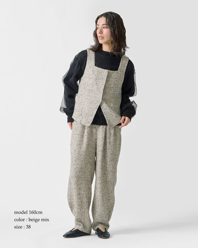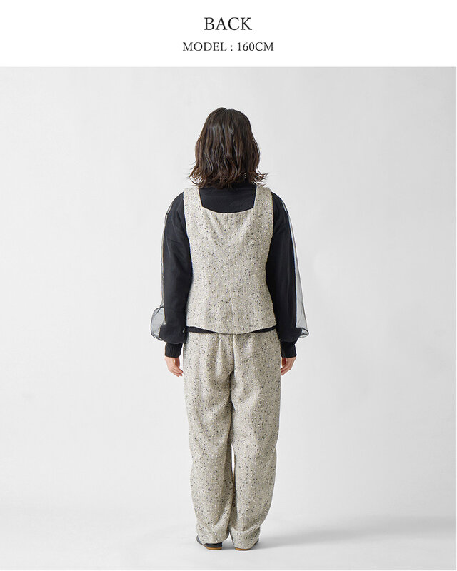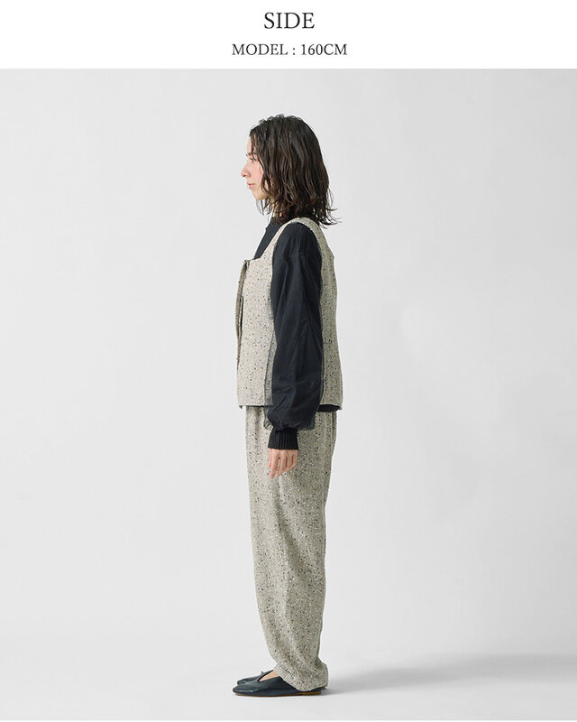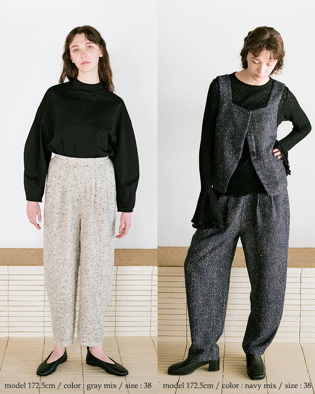whyto(ホワイト)ネップ ツイード トラウザー パンツ “nep tweed trouser”のご紹介です。脇のラインを丸くカーブラインでデザインしたパンツです。裾にかけて、窄まってくるラインが丸いフォルムを強調します。ゆったりと、裾で少しクッションする丈感がメンズライクでおしゃれな印象です。立体感のあるツイード織りに、ネップ糸を織り込んだ奥行きと存在感のある素材です。同素材のビスチェも展開しており、setup可能な品番です。
