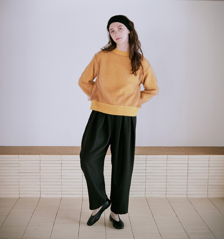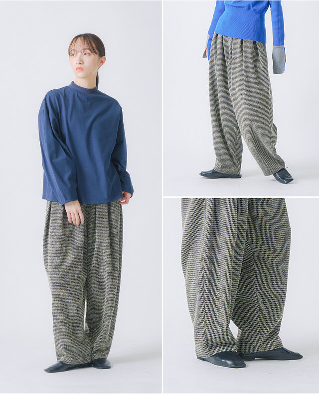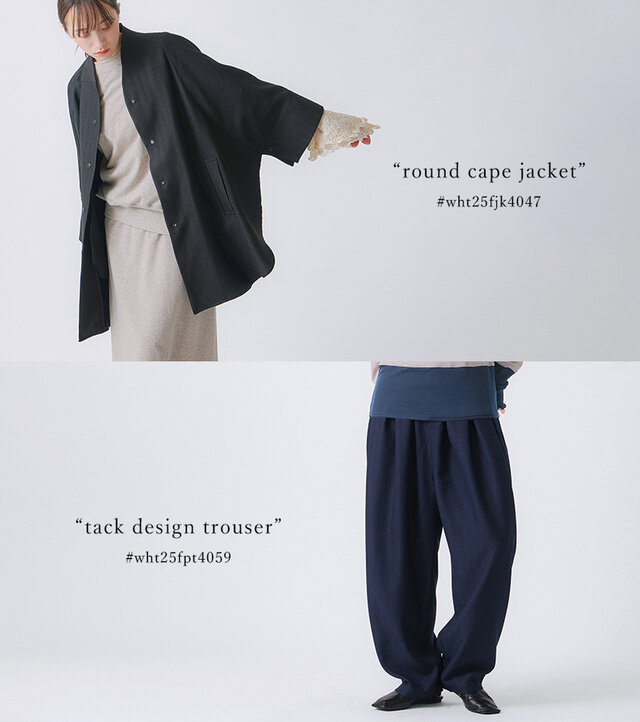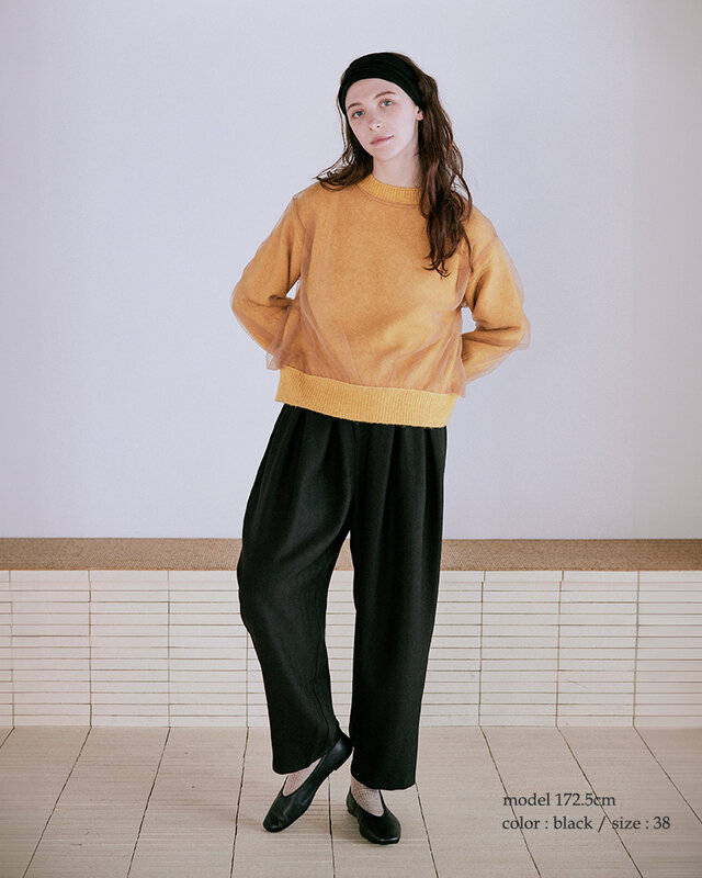 whyto(ホワイト)より、タック デザイン トラウザー パンツ “tack design trouser”のご紹介です。立体的なタックと丸みのあるシルエットが、モード感とリラックス感を兼ね備えた一本。腰回りはすっきりとまとめながら、ヒップから裾にかけてのゆとりが、動くたびに美しいドレープを描きます。足元に向かって自然に細くなるラインは、どんなトップスとも好相性で、着こなしを品よくまとめてくれるのも魅力。後ろウエストはゴム仕様なので、きちんと感がありながらもストレスフリーな着心地を実現。オンにもオフにも取り入れやすい、存在感あるトラウザーです。
