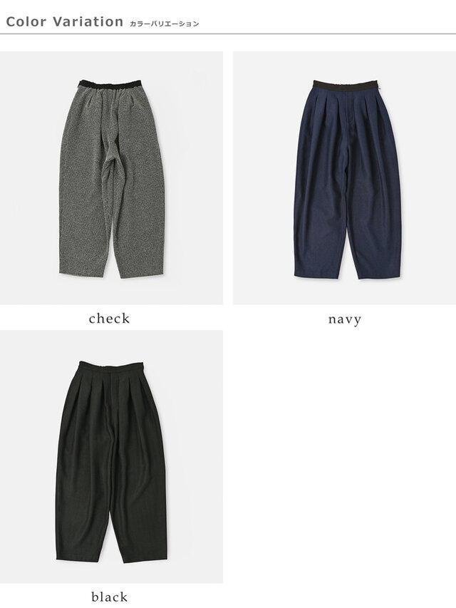 ウエストはゴム+ジッパー仕様のラクチンデザイン。ジッパーをサイドに配置することで、フロントはすっきりとした印象に。大きめのタックがあしらわれ、上品でありながらゆとりのあるリラクシーな仕上がりです。