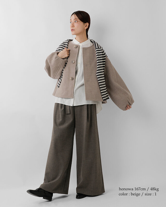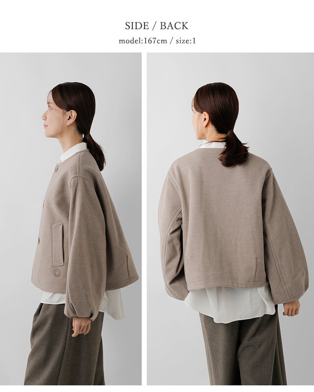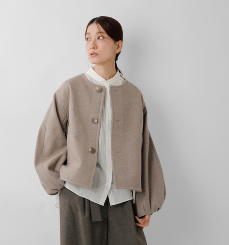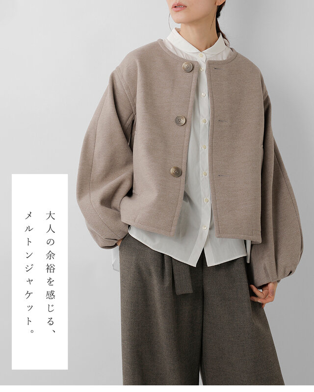 ウールライクなポリエステルメルトンを使用したノーカラージャケット。丸みを帯びたシルエットが印象的なラウンドネックで、シンプルながらも洗練された印象を与えます。顔まわりをすっきりと見せるノーカラーデザインに、袖のボリュームを出すことで重厚感を演出しています。
