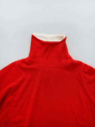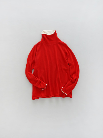 ネックや袖口の配色がポイントのハイネックニットです。ぴったりしすぎずダボつかないサイジング、厚地過ぎないので、1枚でも重ね着でも活躍するアイテムです。首元と袖口のみ生地が二重になっており、身頃や袖部分はすっきりとした仕立てになっています。