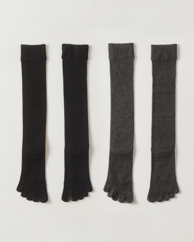 ふくらはぎは浮腫みを軽減し足をすっきりと見せてくれる段階着圧、足先は5本指仕様の爽健美ソックス。