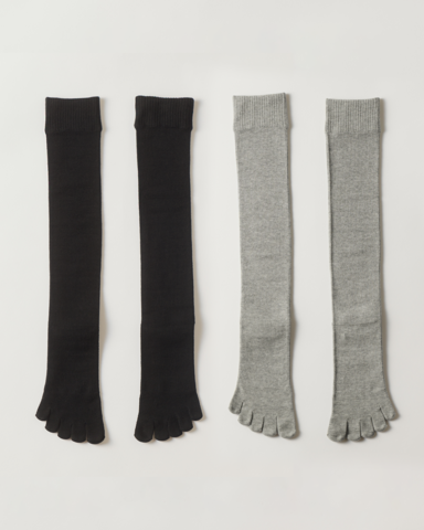 ふくらはぎは浮腫みを軽減し足をすっきりと見せてくれる段階着圧、足先は5本指仕様の爽健美ソックス。