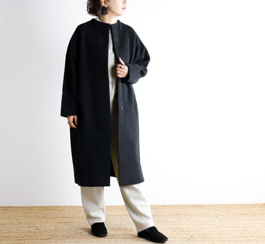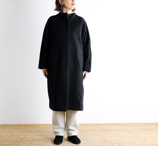 定番のプレスウールシリーズ。柔らかなウール糸で編んだニット地を圧縮することで、しっかりとした生地に仕上がります。少し立ち上がったネックラインとゆったりと長めの着丈が上品なロングコート。素材本来の風合いとあたたかさを感じていただける裏地のない仕様です。