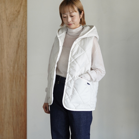 軽さと暖かさを両立したフード付きの中綿ベスト。4インチのダイヤモンドキルトを施した生地は、見た目にも立体感があり、程よくボリュームのある仕上がりです。