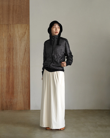 クリーンなホワイトスカートと好対照を描き、軽やかに抜け感をプラス。存在感がありながらも、日常に溶け込むリラクシーな華やぎが魅力。