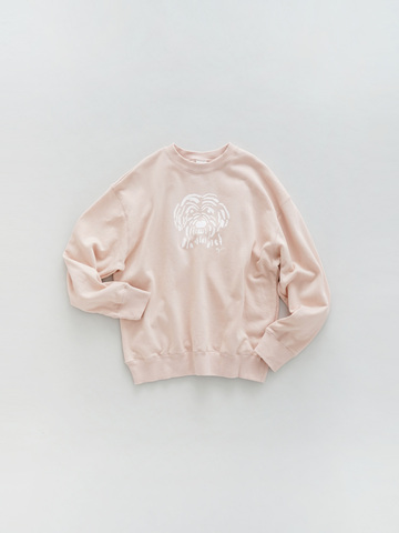 秋冬のカジュアルファッションに欠かせないスウェット。フロントには、シャギードッグのプリントを施しました。"ブリアード"という犬種がモデルの、もじゃもじゃっとした毛がチャームポイントのわんちゃん。寒い季節に温かみを感じられるイラストです。まっすぐ前をみてじっと何かを考えているような表情が、なんとも言えず可愛らしいです。単色で描かれているので、大人の着こなしにも馴染みやすいプリントスウェットです。