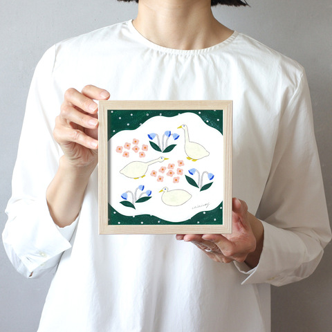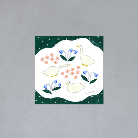 イラストレーター・テキスタイルデザイナーとして活躍する「安原ちひろ」さんがデザインした15cmサイズのポスターです。花と雪と戯れる鳥たちの楽しそうな表情に癒される一枚。
