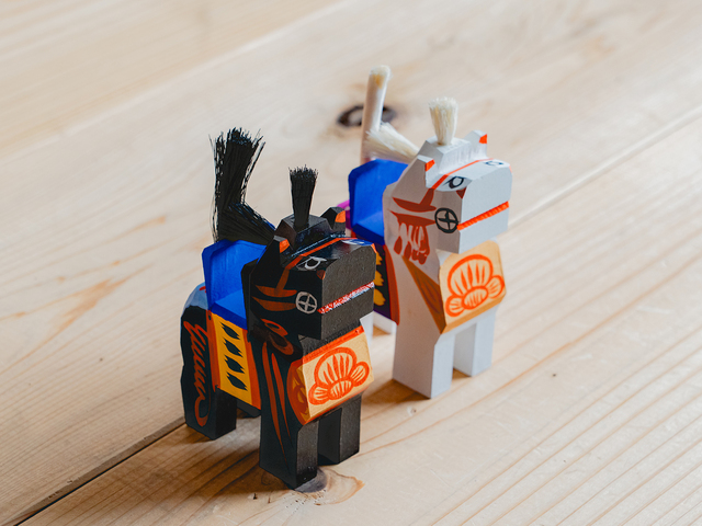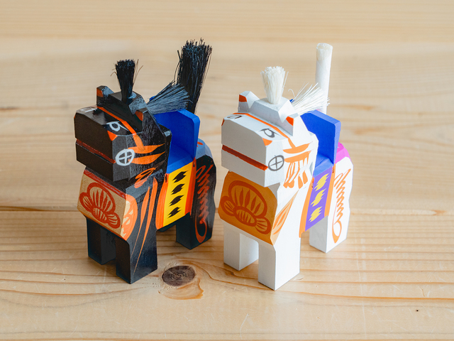 福島県は江戸時代より、全国的に有名な馬の産地となりました。そしてこの馬をモチーフに作られはじめたのが郷土玩具の三春駒(みはるごま)です。黒色が子供のお守り、白色がお年寄りのお守りと言われる縁起物です。仙台の木ノ下駒(きのしたごま)、八戸の八幡馬(やわたうま)とともに日本の三大駒(さんだいごま)とよばれています。