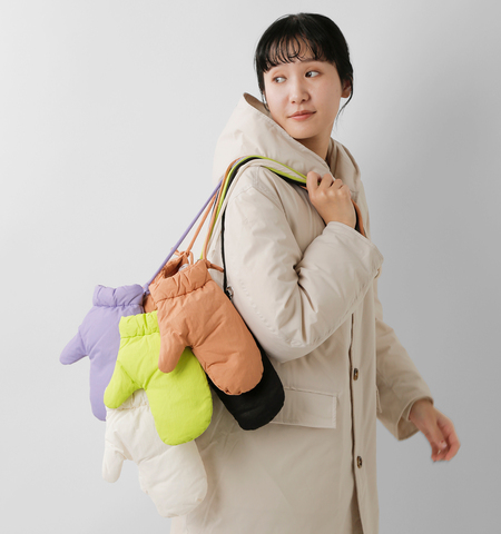 miffew(ミフュー)より、ダウン ミトン “DOWN MITTENS”をご紹介します。もこっと丸みのあるフォルムが愛らしいダウン入りミトン。手に着用するのはもちろん、付属の丸紐をつなげて首から下げれば、スタイリングのアクセントにもなります。柔らかな印象で豊富なカラーバリエーションを揃えました。バッグにぶら下げる際に便利な円形カラビナ付きで、内側は肌触りの良いトリコットフリースを使用。見た目の可愛さと使いやすさ、あたたかさを兼ね備えた一品です。