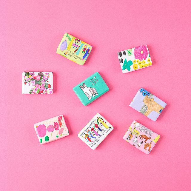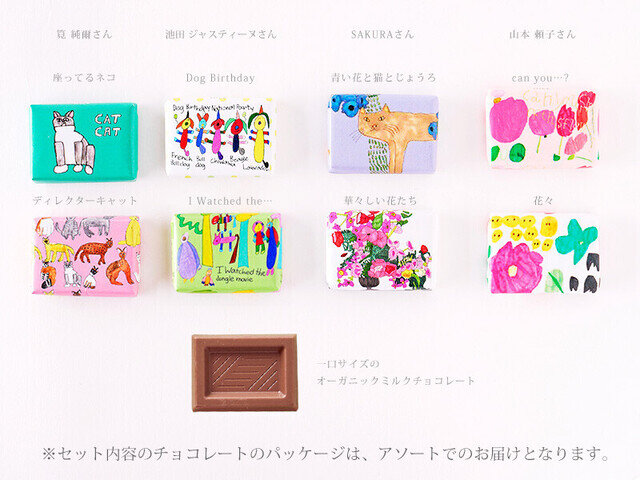 SAKURAさん、池田 ジャスティーヌさん、筧 純爾さん、山本 頼子さん、4人のアーティストの作品が一口サイズのミルクチョコレートのパッケージになりました。
