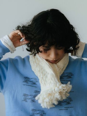 立体感のある編み模様が愛らしく、両端のループのボリュームもアクセントに。片方の端を裏側に通すだけできれいにまとまる、簡単に巻けるデザインになっています。