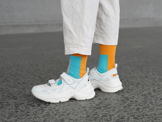 履く角度によって見える色が変わり、足もとにさりげない動きを生み出します。カラーは三色展開。イエローは春の訪れ、グリーン×オレンジは夏の明るさ、ネイビーは秋のぬくもりをイメージ。季節の移ろいを、足元から軽やかに感じてください。
