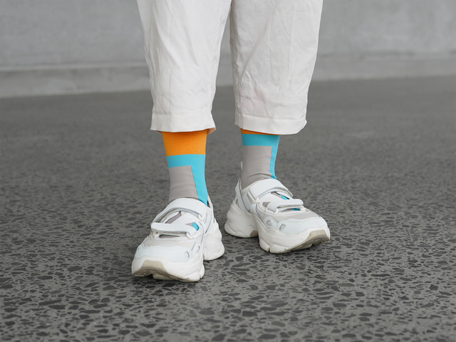 上杉公園のお堀と、そこに並ぶ石造をイメージしてデザインした クルーソックス「block」は、水面に映る光や石の陰影がつくるリズムを、ブロックの形と色の重なりでパキッと表現しました。