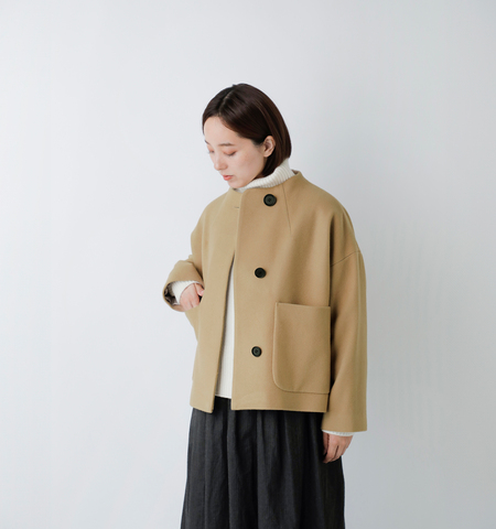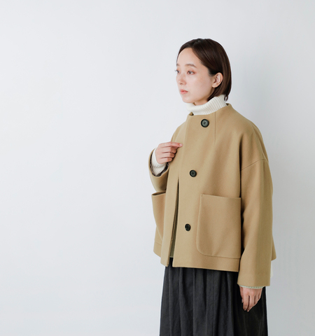 わずかに立ち上がりのあるラウンドネックが、首元をすっきりと見せながら柔らかな印象を演出します。ミニマルなデザインの中で、大きなボタンがさりげないアクセントとして際立ちます。