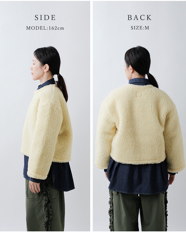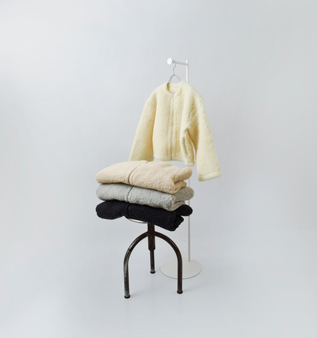 小型の羊「ムフロン」のウールを使用した、ふんわりとしたボア素材。見た目にもあたたかく、柔らかな手触りで着心地も快適です。軽やかで柔軟性があり、体温調整もしやすく、デイリーに活躍する一枚です。