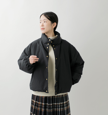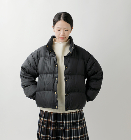 横段の無いクリーンなデザインと、光沢のある高密度ポリエステル素材に横段のステッチを施したスポーティーなデザインの両面で着用できるダウンジャケット。程よくドロップしたショルダーラインと、抜け感のある優しいシルエットが魅力で、重ね着がしやすく、様々なシルエットのボトムスとの相性が良いです。