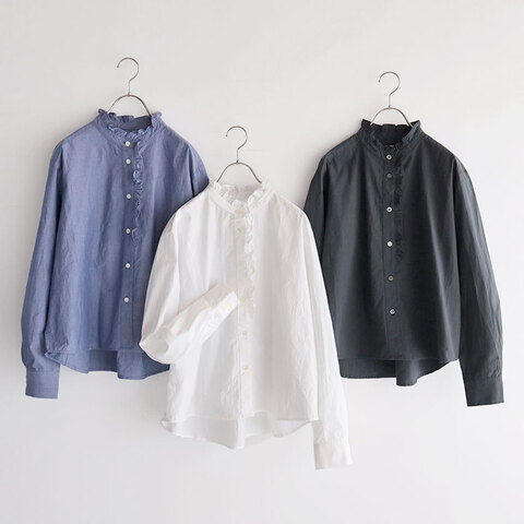 「MidiUmi(ミディウミ)」より、首元から胸元にかけてのフリルが大人可愛いシャツのご紹介です。