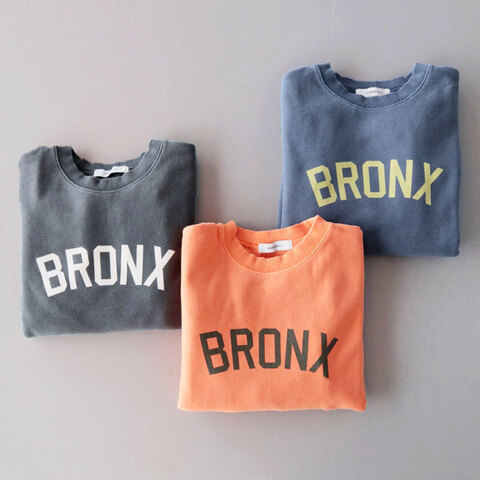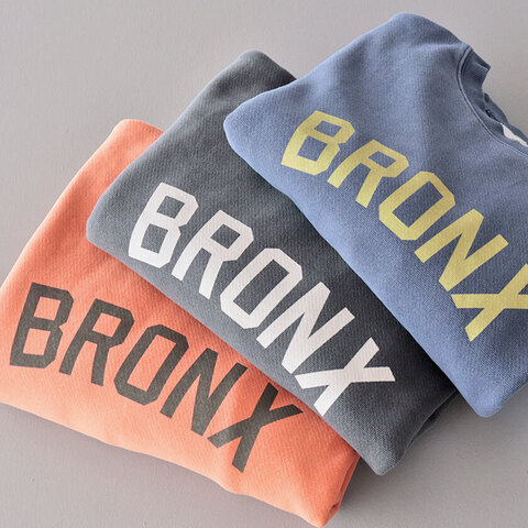 ゆったりワイドな身幅と脇リブの裾にタックを入れることで丸みのあるシルエットを作り出しています。ボリュームのある袖もポイントで袖口と裾、首元をリブ仕様にすることでメリハリのある印象に。着丈は長すぎないように設定し、シャツやカットソーとのレイヤードにも最適です。ヒップホップ発祥の地であるニューヨーク最北端の都市ブロンクスのロゴプリントがほどよく存在感を放ち、シンプルなデザインのアクセントになっています。
