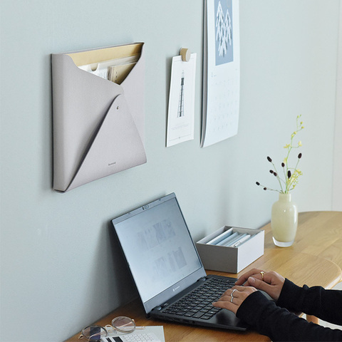 冷蔵庫の側面やリビングの壁など、どんなお部屋にも馴染むフェイクレザー素材。すぐ手に取りたいけど散らかしたくない、そんな書類の一時置きで暮らしを整えます。