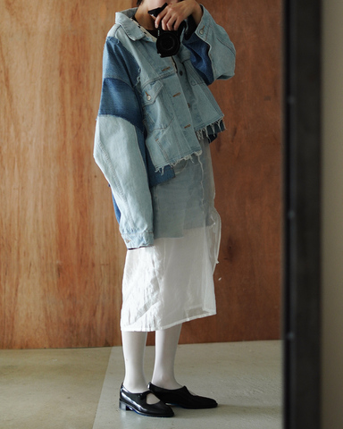 パッチワーク的なツギハギにより、メンズサイズのようなオーバーサイズを表現。古着ならではのフェード感やカットオフといった、リメイクならではのディテールが非凡な印象を与える一着。