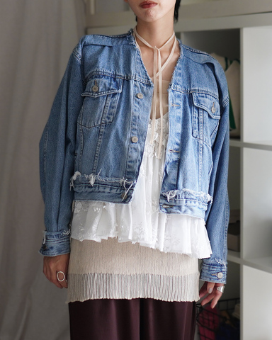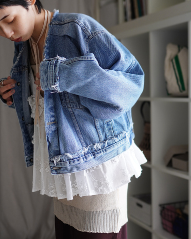 古着のデニムジャケットをリメイクした、QUIITOのシグネチャー的なアイテム。古着にしかない良さに加えて、ファッション的なギミックも備えた逸品。既存の枠にとらわれない自由な発想には、デザイナーのセンスが冴えわたる。