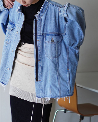 断ち襟のスタンドカラーやジップアップなど既存の枠にとらわれない自由な発想には、デザイナーのセンスが冴えわたる。古着ならではのフェード感やカットオフといった、リメイクならではのディテールが非凡な印象を与える一着。