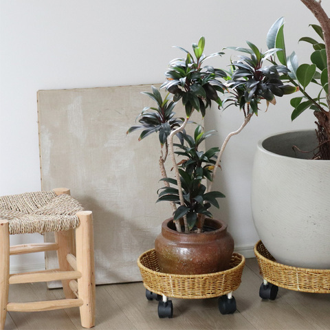 まるで天然素材のラタンを編んだような、ナチュラルな佇まいのプランターベース。植物との相性はもちろん、周りの家具やフローリングの木目とも馴染んでくれます。