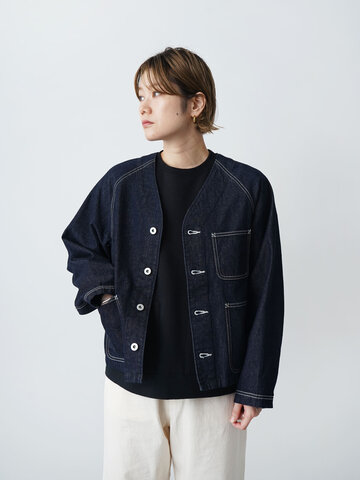 すっきりとした首元と、ややコンパクトな着丈が特徴のデニムジャケットです。ニットやスウェットなど厚手のアイテムの上からも窮屈感なく羽織れるよう、身幅やアームホールにゆとりを持たせつつ、オーバー過ぎないサイジングになっています。ヴィンテージのエンジニアジャケットのデザインをベースにしワークウェアのディテールを取り入れながらも、デイリーに馴染むようカジュアルさのバランスに拘った1着です。