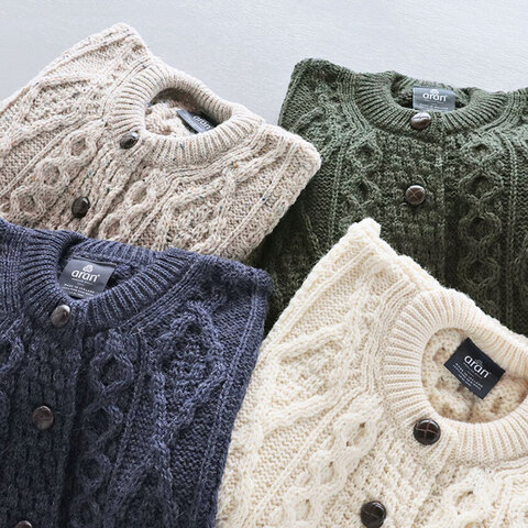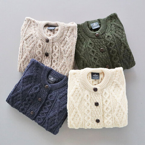 アイルランドの老舗ニットメーカー「Aran Woollen Mills (アランウーレンミルズ)」より、美しい立体的な編み模様が目を惹くカーディガンのご紹介です。