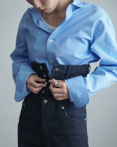 ウエストをドッキングしたデザインは、ボタンの開け閉めでハイウエストやローウェスト、オーバーオールのように、多様な着こなしができる仕様。そのオリジナリティが非凡な印象を与える一着。