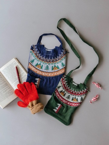 ログハウスや雪の結晶など、冬らしい柄のセーターを表現したユニークなミニポシェット。