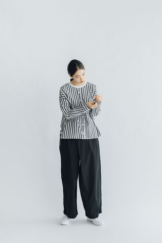 UNIVERSAL TISSU|バンドカラーシャーリングブラウス ストライプ