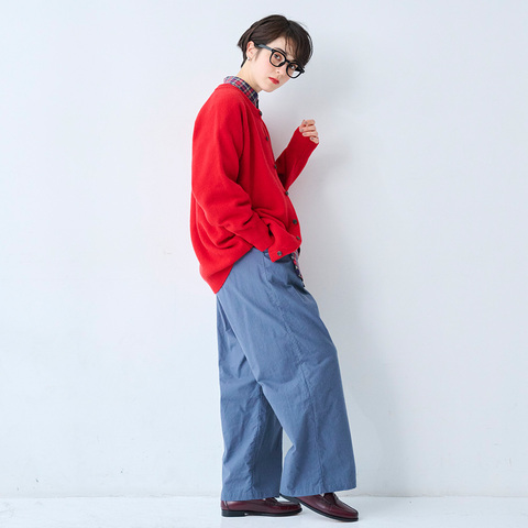 フロントにあしらった2カ所のタックにより、立体感が生まれ、スッキリとした脚ラインに。ゆったりワイドでも、落ち感がありストンと見えるこだわりのシルエット。