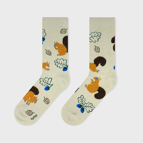 様々なポーズのリスたちと、どんぐりや松ぼっくりが靴下の絵柄に再現されました。