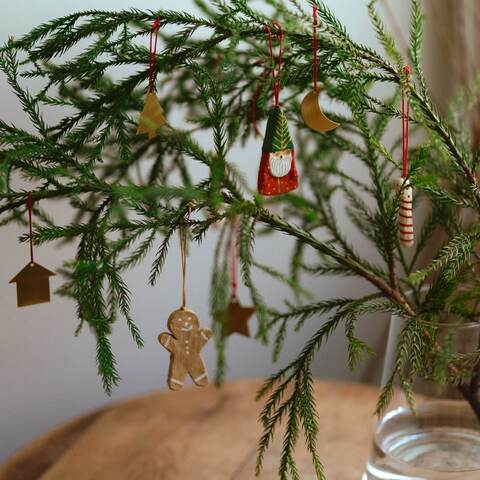 ブラスオーナメントは月、星、木、リーフ、家の5種類。温かな真鍮の輝きは、ほかのオーナメントとも自然になじみます。お持ちの飾りに加えると、やさしい雰囲気を添えてくれますよ。
