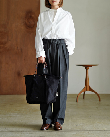ナチュラルなキャンバスとスエードを組み合わせた独自のデザインが魅力のトートバッグ。巾着のように絞ることで、HAIDAGWAIIの植物「POLY」を思わせる丸みのあるシルエットに変化します。