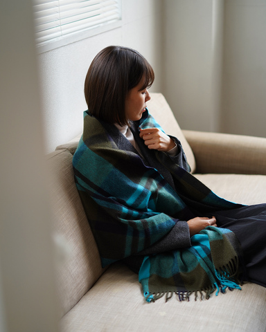 シンプルな装いにも品よく映えるチェック柄は、英国らしさとモダンな感性が絶妙に調和。ストールとして首に巻いたり、ライトアウター感覚で羽織ったり、ひざ掛けにしたりと日常のさまざまなシーンで活躍します。