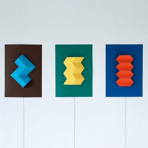 紙だからできる、山折りと谷折りでできた幾何学立体の表現。消灯時・点灯時問わず陰影が美しいライトです。
