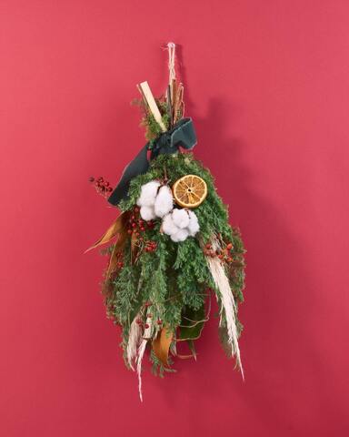 *スワッグを吊り下げるための麻紐は、長さが調節できるように軽めに結んでいます。お飾りいただく際は、落下防止のためしっかりと結んでから吊り下げください。