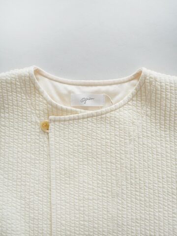 シャツや薄手のニットも着こめるように、身幅や袖はゆったりとしたサイジングになっています。すっきりとしたノーカラーなので、首元にデザインのあるインナーや、タートルネックとも相性抜群です。