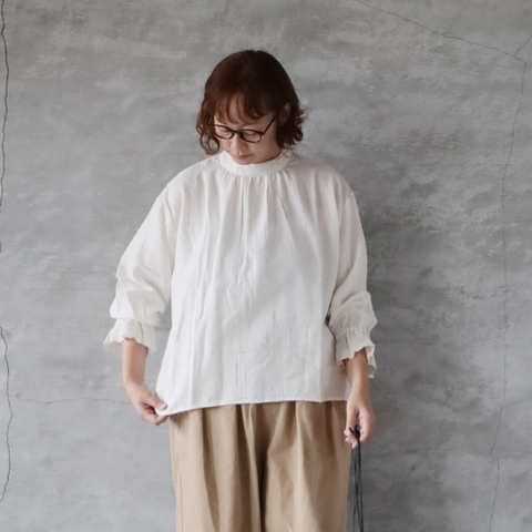 blue willow|コットンリネンへリンボン袖フリルブラウス