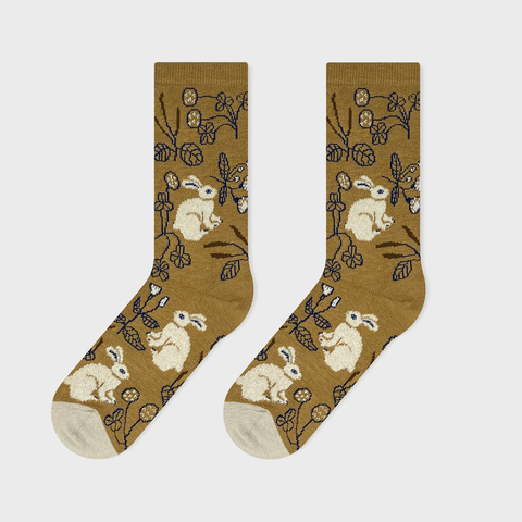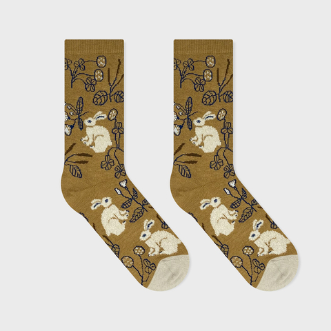 シロツメクサやオオバコなどのボタニカルと、ウサギが靴下の絵柄に再現されました。