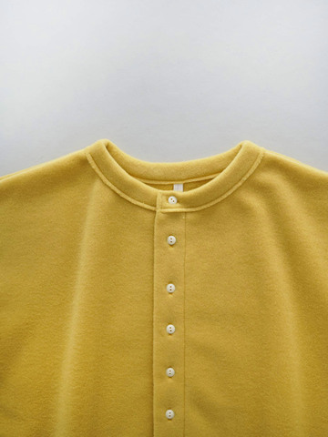 程よくゆとりを持たせたスクエアシルエット。フロントにたくさん並んだ小さなボタンがデザインポイントになっています。ボタンを閉めて、プルオーバー風の着こなしもおすすめです。少し高さのある襟元が、顔まわりをすっきりと見せてくれます。