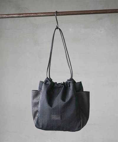 ・軽やかなナイロンと上質なレザーを組み合わせた、洗練されたデザインのギャザーポケットバッグ。